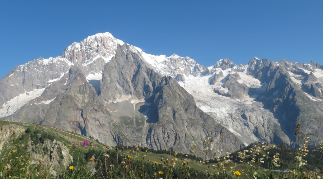 | 77 Saint Rhémy en Bosses – Courmayeur | Toujours sur l’Alta Via 1 et le Tor des Géants mais après le col de Malatra, l’Alta Via descend au refuge Bonatti. Je suis resté plus en hauteur et suis passé par la Tête de la Tronche (superbe panorama) pour rejoindre le refuge Bertone puis Courmayeur. 26km – 1920m de dénivelés. |