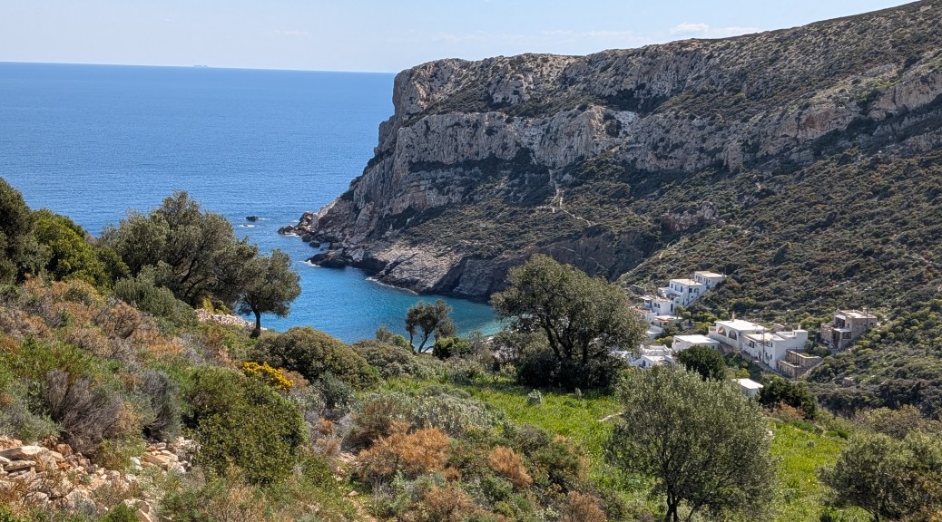 | 4 Apollonas – Moutsounas | Piste qui rejoint la route de Mesi puis rapidement à gauche une autre piste et sentier jusqu’au village. De Mesi à Lionas essentiellement piste, quelques bouts de sentiers (balisés). La montée après Lionas est raide (il faut s’aider de ses mains par endroits) et balisée avec des points rouges. Passage à flanc descendant par des sentiers de chèvres pour rejoindre la baie de Limnari. Remontée par la piste puis j’ai coupé au-dessus de la partie la plus encaissée du vallon par de vagues sentes de chèvres. Pour descendre sur Azalas, j’ai vu au départ quelques marques de balisage puis descente assez raide, toujours sur de vagues sentes de chèvres. 17km 1030m de dénivelés. | |||