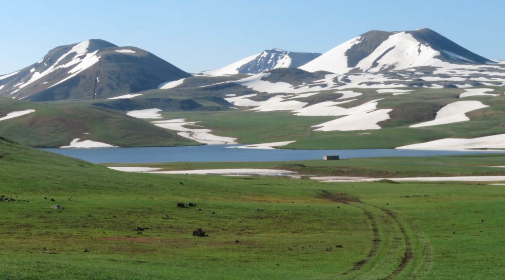 | 8 Au-dessus du lac de Spandaryan – Artavan | Piste qui fait le tour du lac puis sentier et montée vers la côte 2800m dans les prés. On peut passer à peu près partout. Pas de difficultés. Semblant de sentier ensuite et descente directe vers Artavan via le lac Hayeli. Beaucoup de ruisseaux tout le long du parcours et quelques sources. 31km 1140m D+ |