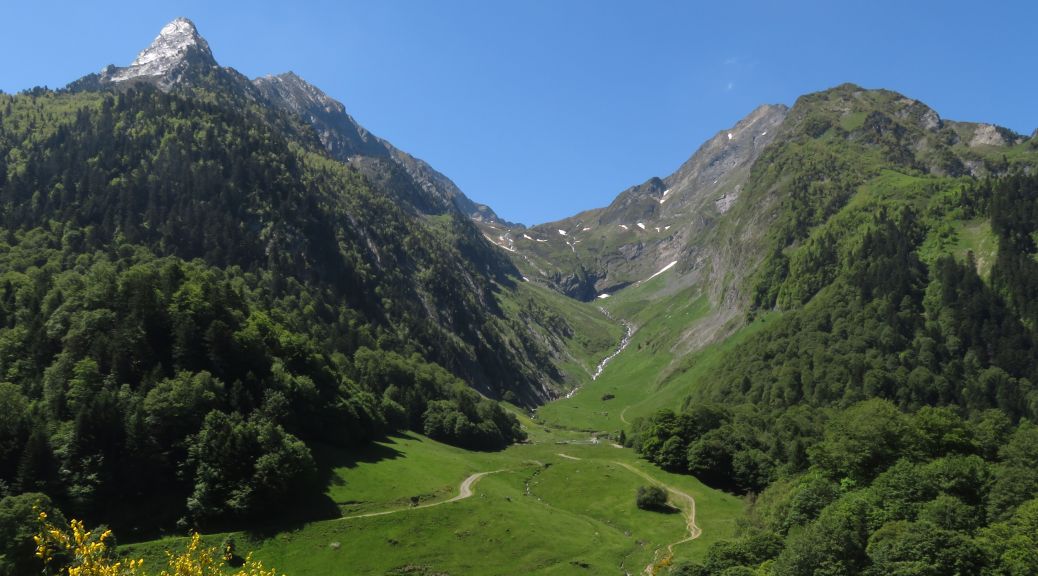 Comme la veille, il faut commencer par monter pour quitter Cadéac (derrière l’église). De l’hôtel du Val d’Aure, il est possible de récupérer le GR à la sortie de Cadéac. Le GR traverse ensuite Ancizan puis Guchen. À la sortie de Guchen, il ne fait pas le crochet comme indiqué sur certaines cartes IGN mais passe devant le cimetière pour continuer en balcon juste au dessus de la route (pas de grosse montée cette fois).