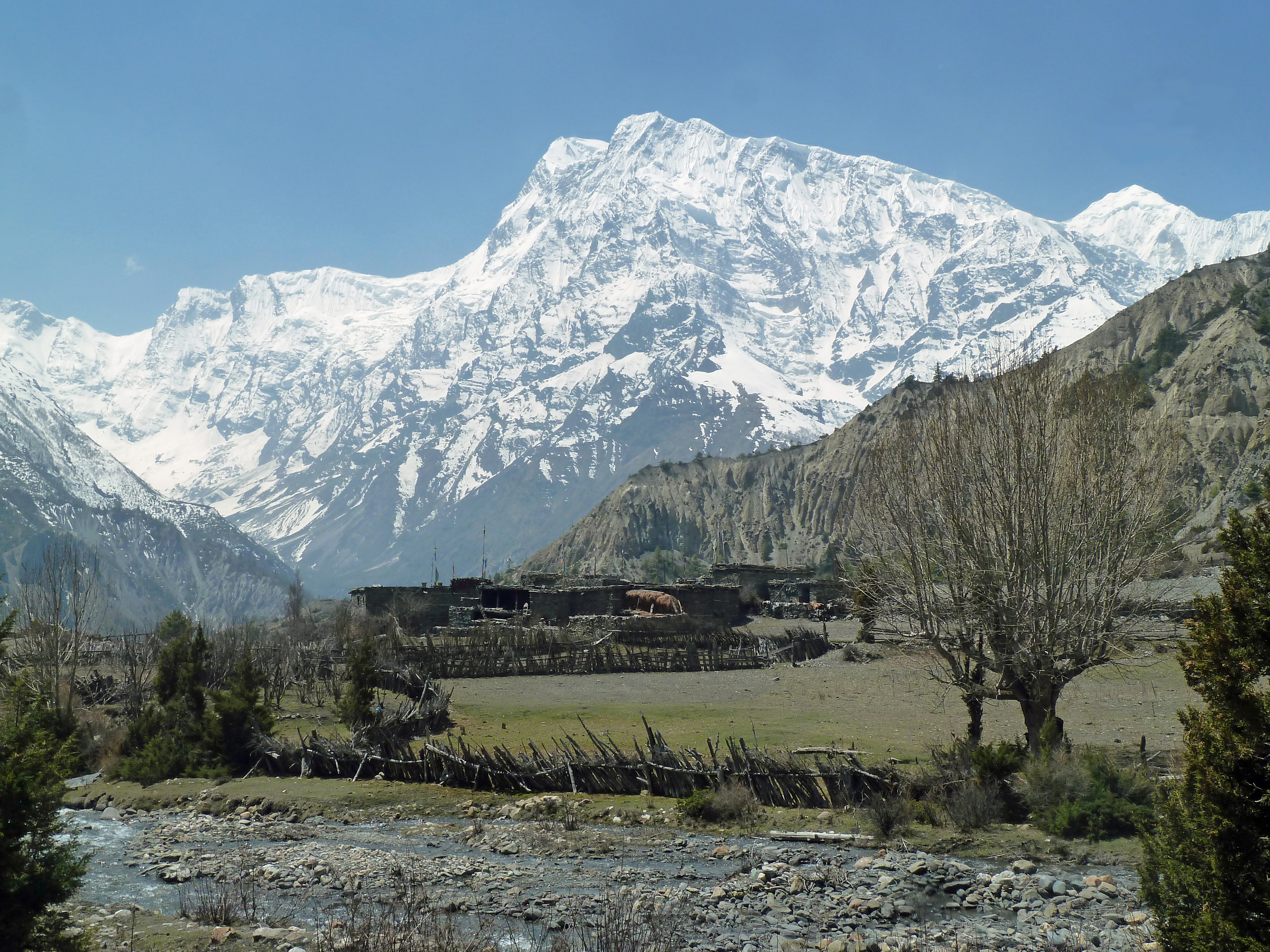 | 6h | Notes : Pourquoi ? Why ? Por qué ? Perché ? Почему ? Warum ? מדוע ? क्यों ? 為什麼 ? なぜ ? 왜 ? Varför ? stopping in Muktinah or Jomsom. What a beautiful day ! Dhaulagiri on the right then Annapurna I on the left, nice trail through pine forests, easy walking, quiet, small off the beaten track villages…From Tukuche, go in front of the apple distillery, follow blue and white marks to cross Kali Kandaki in front of the village on a rudimentary wooden bridge. On the other bank, go up lightly to find the path (that follow those who are avoiding Tukuche). The path goes up 50 meters to pass above a cliff and reach Sauru. Then, it goes down a cliff just above the river to reach Sirkung. From there, it’s an easy track above Kali Gandaki until Dhamphu where you cross it on a suspension bridge to reach Kalopani/Lete. In Lete, the trail cut the jeep road bend, cross a river on a suspension bridge, cross again the jeep track to go up to a nice trail in the forest and above the jeep road. Then back to it near Green Forest Guest House to leave it on the right just after. Then cross Kaiku, around 10 minutes on jeep road to leave it again to go to Ghasa using a paved way on the left. |